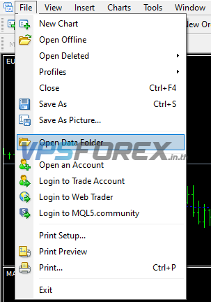 หลังจากที่เราได้ดาวน์โหลด EA มาแล้วให้เราแต่ไฟล์ zip ออกมาเราก็จะได้ไฟล์ .ex4 มาไว้ จากนั้นก็นำไปใส่ใน Folder ของโปรแกรม MT4 ที่เราใช้งานครับ โดยการเปิด MT4 ขึ้นมาแล้วก็ไปที่ File>Open Data Folder