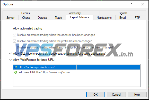 จากนั้นไปที่ Tab ที่ชื่อว่า Expert Advisors ครับ แล้วก็ใส่ลิงค์ลงไปที่ Allow WebRequest for listed URL :